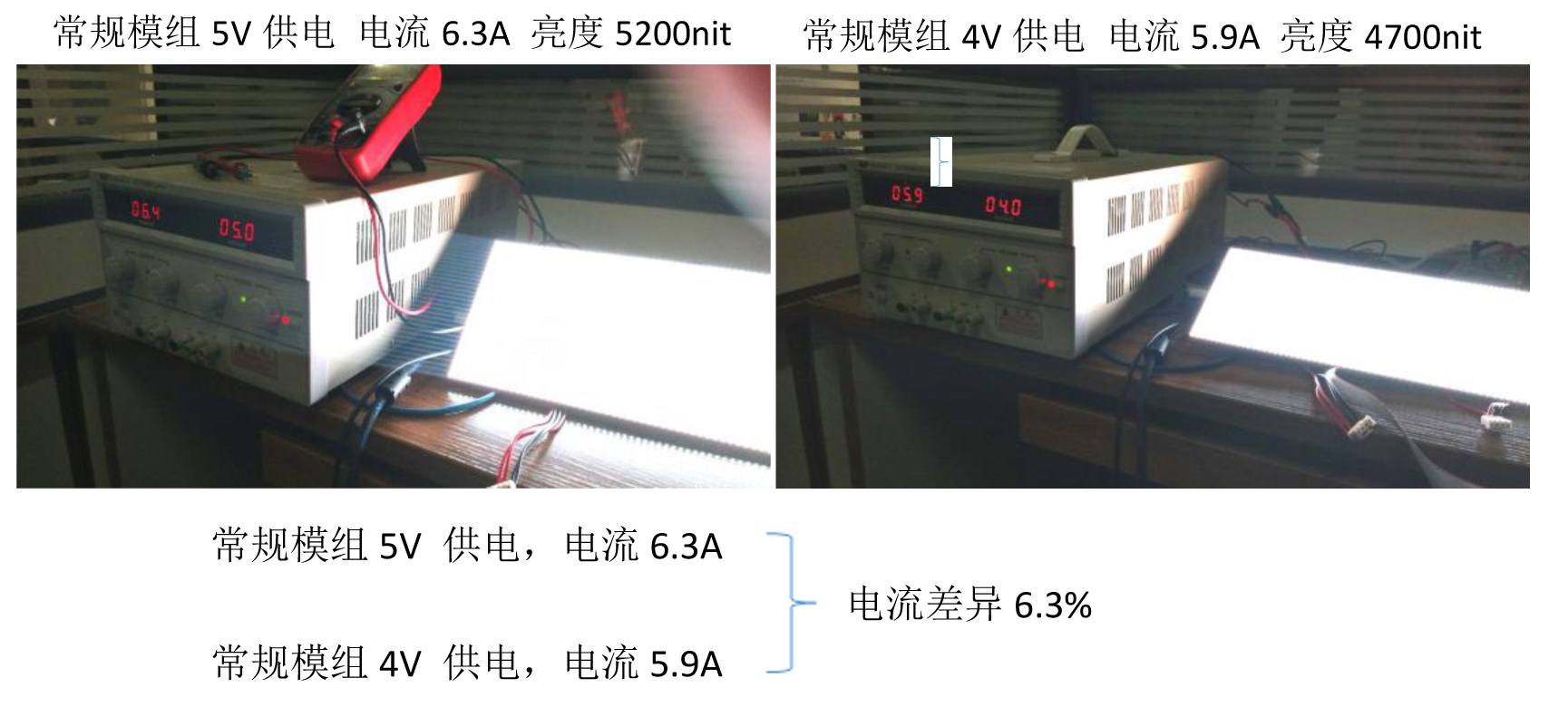 經(jīng)測試P5和P8的模組均可使用4V電壓供電保證模組電流、亮度、顏色無變化,實測節(jié)能比例可達(dá)21%。